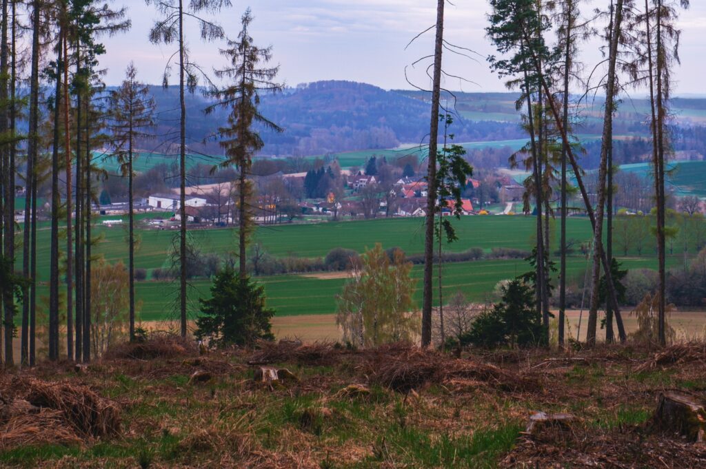 Chybějící les ale nabídl také úplně nové pohledy do krajiny. Ze svahů choustnické hory je vidět Předboř, statek Šimečků, dům Novotných, starý teletník… trochu dál na jihu je hora budislavská. I ona přišla o většinu smrkového lesa a jen nahoře přežívají staré bučiny. Pojďme ale dál… stačí ujít pár desítek kroků a dole se v povzdálí u silnice na Psárov objeví Pakostův mlýn. Za dalších pár desítek kroků je hned vedle silničky jednoduchý železný kříž, vztyčený na památku posledního jelena zastřeleného v choustnickém polesí.